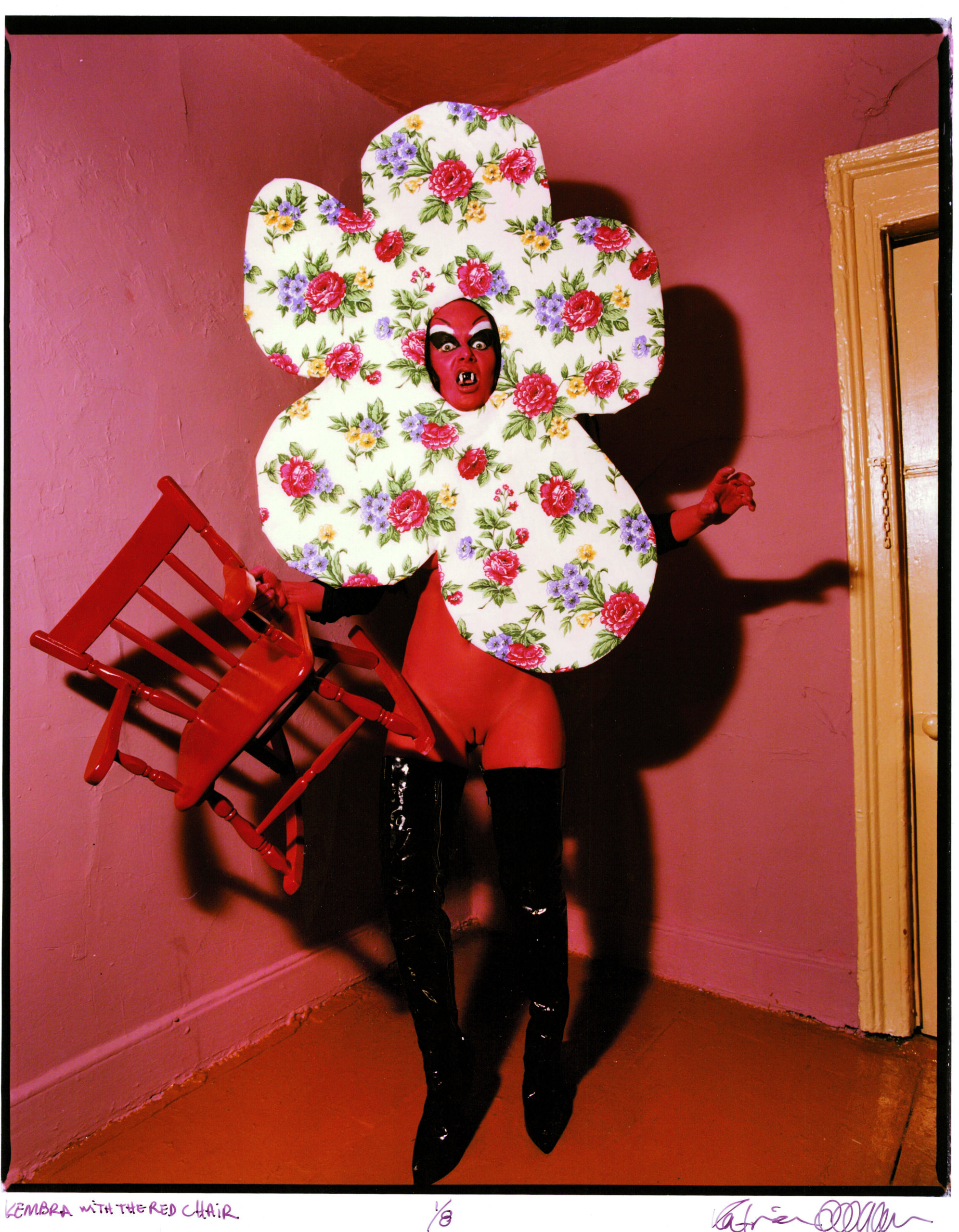 Kembra Pfahler with red chair and flower headdress, c. 1995. Katrina del Mar.