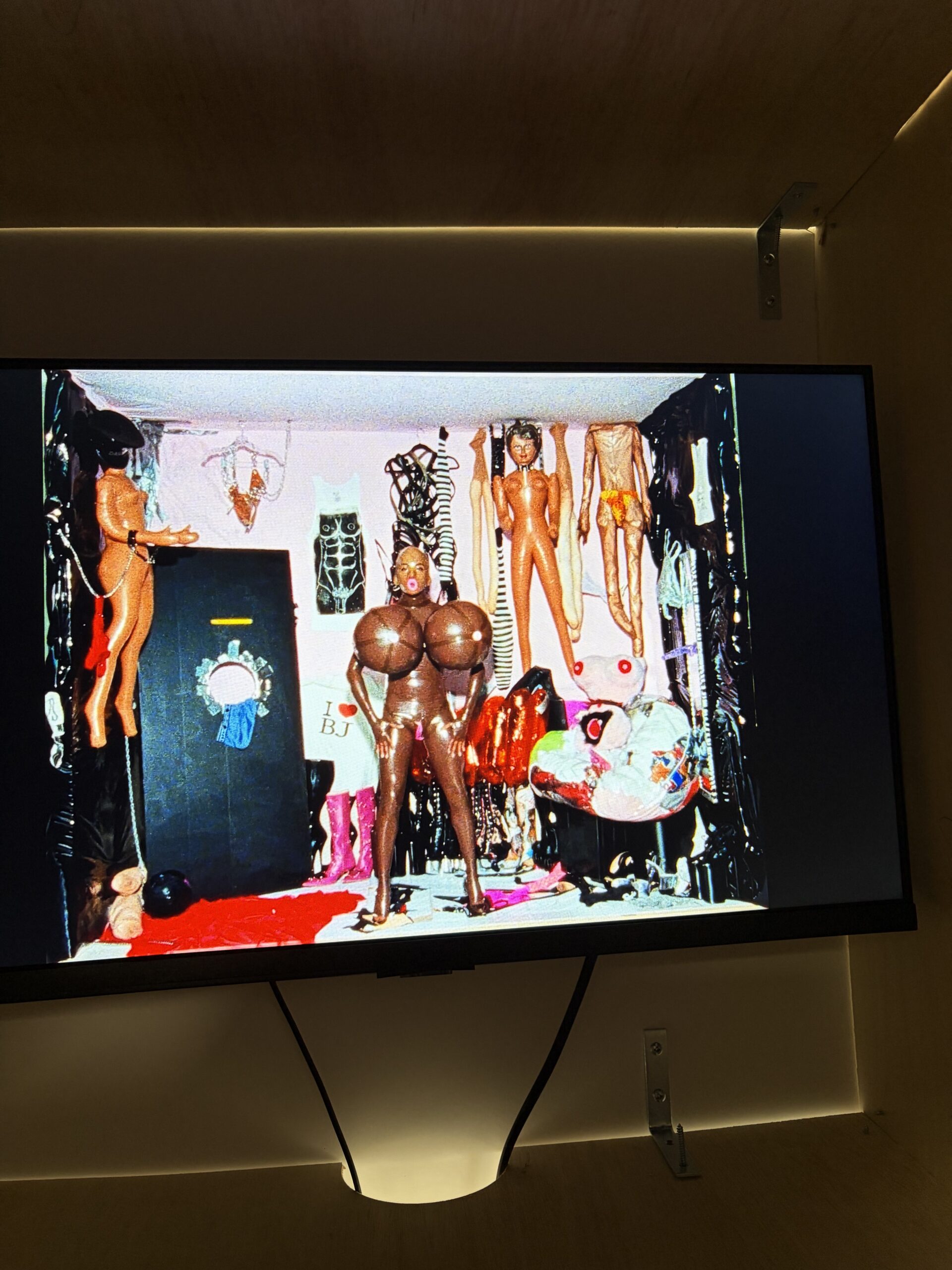 My favorite character would have to be “Sex Doll.” The doll isn’t perfect. She has wear and tear. I was yearning to break down the hypersexualization of trans identities by becoming this limitless figurine that holds power behind closed doors. Placing myself in a custom vinyl bodysuit, massive boobs, tissue paper vagina, and a silicone sex doll mask, I was fully immersed in this fantasy.