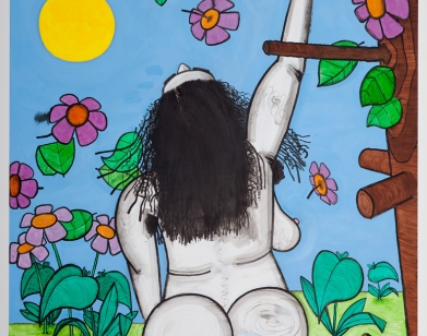 In Dunham’s fourth solo show at Barbara Gladstone in New York, the artist focuses entirely on paintings of trees and women bathing amidst idyllic, wooded scenes.