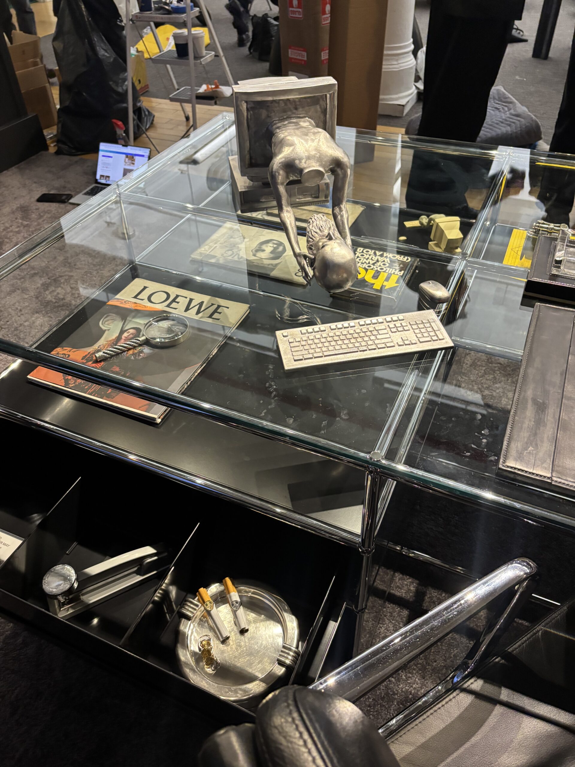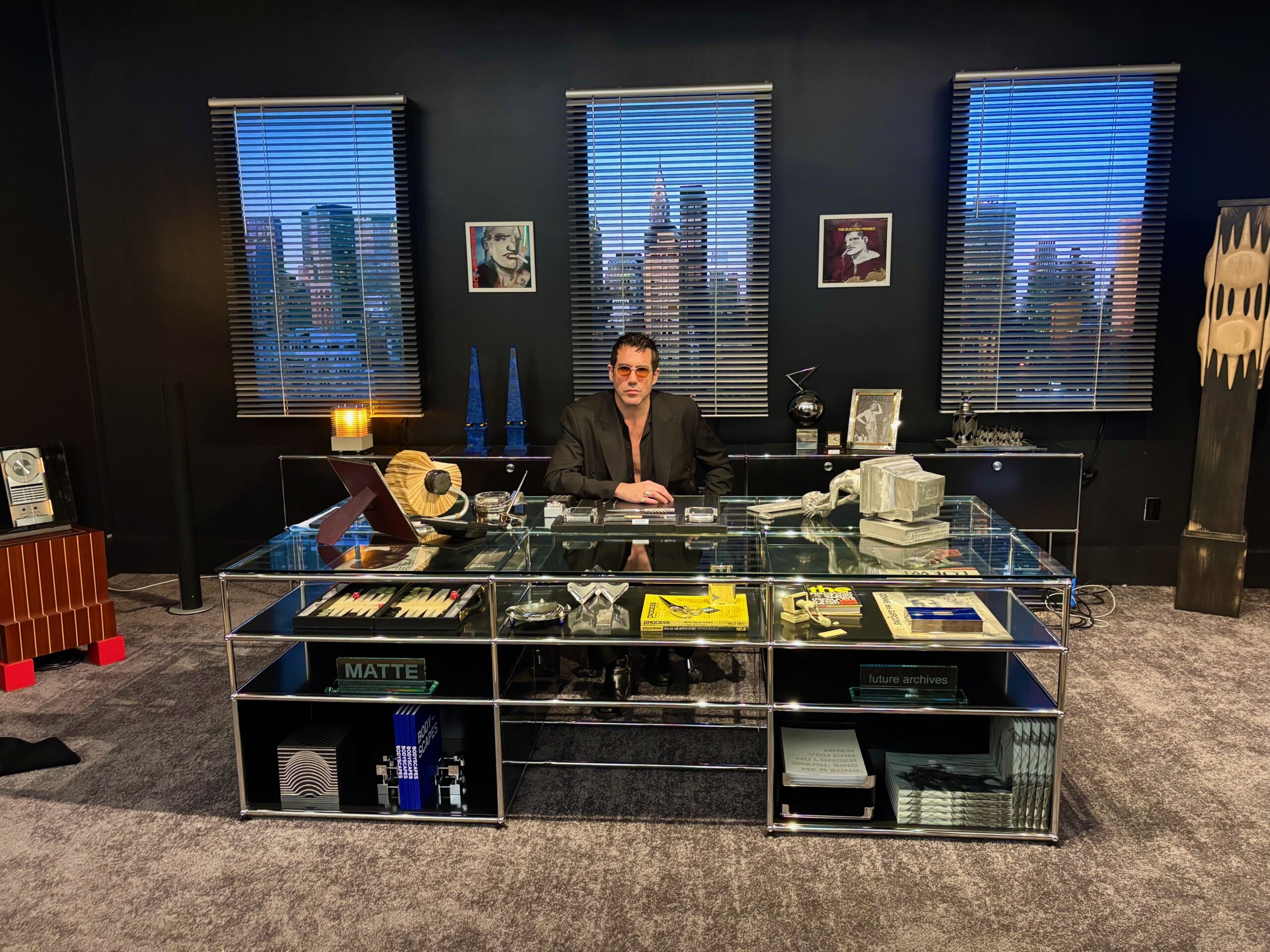 As Alexander May told me last week, “People are starting to crave their own space, and their own identity around work.” In his new collaboration with USM, The Architecture of Work, the designer explores exactly that: how place shapes practice, and how our environments constantly influence our process. Displayed at the Basic.Space pop-up in Soho, the show features one of six modular officescapes, including “The Collector,” a cinematic ode to ’80s New York and its spirit of glamorous, hyper-corporate minimalism. Embellished with art-deco collectables from Mantiques Modern, and fitted with layered lacquered draws, the unit sits boldly in front of a flickering projection of the New York City skyline. On opening night, I stopped by for a quick cigarette with the designer, curator, and confirmed desk smoker to ask all about his own work habits, design dont’s, and why dingy corporate is back.