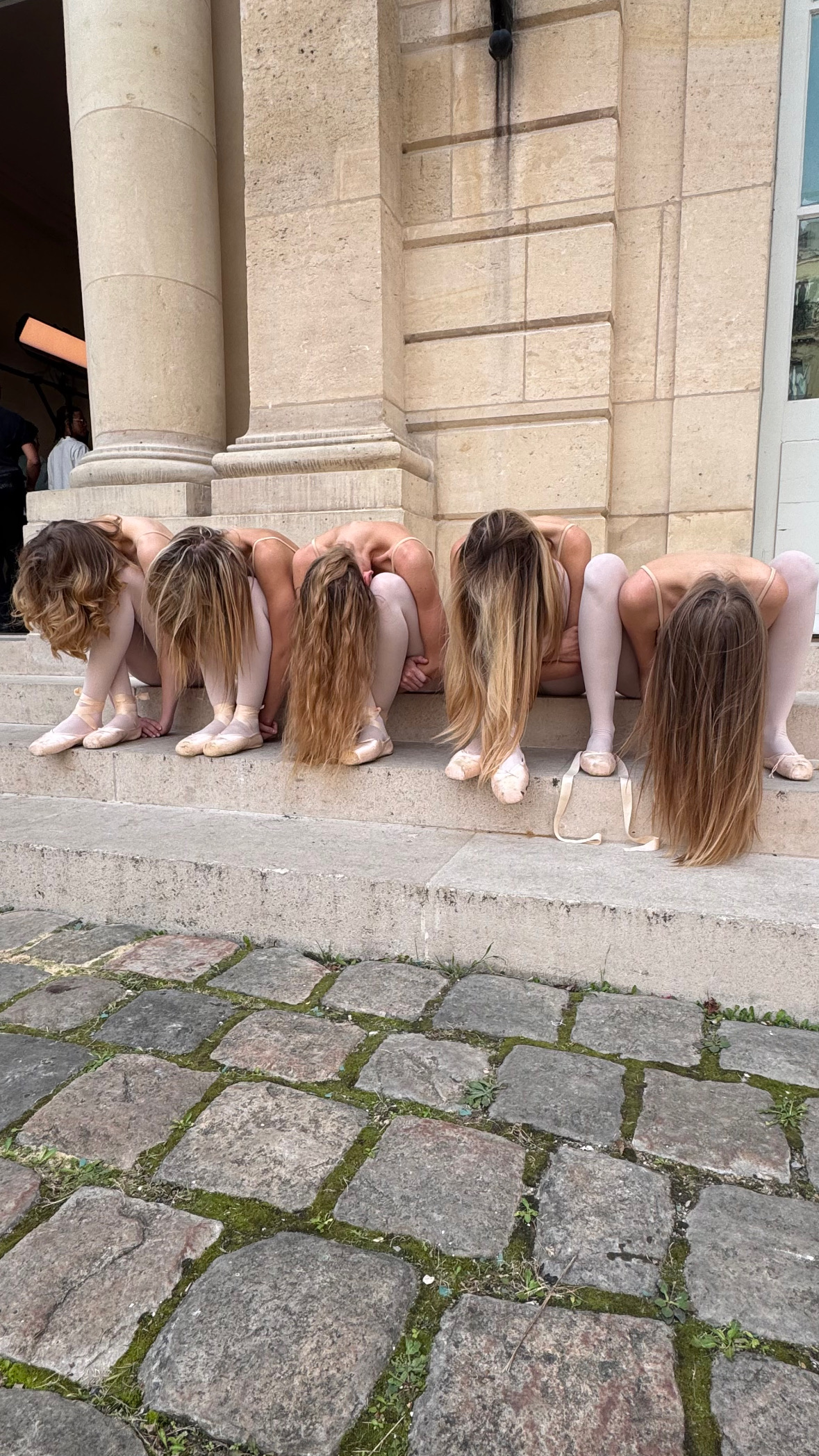 I say hi to Patti Wilson on our way into the ENFANTS RICHES DÉPRIMÉS venue. “That Rabanne show was something!,” she says in a way I can’t quite decipher. Outside, blondes in ballet shoes are seated, hunched over, hair blowing in the wind. Inside, an exhausted-looking Cobrasnake snaps my photo and we exchange classic fashion week pleasantries. “When did you get in? How late were you out last night? I’m sooooo tired,” etc. The theme of the day is exhaustion.