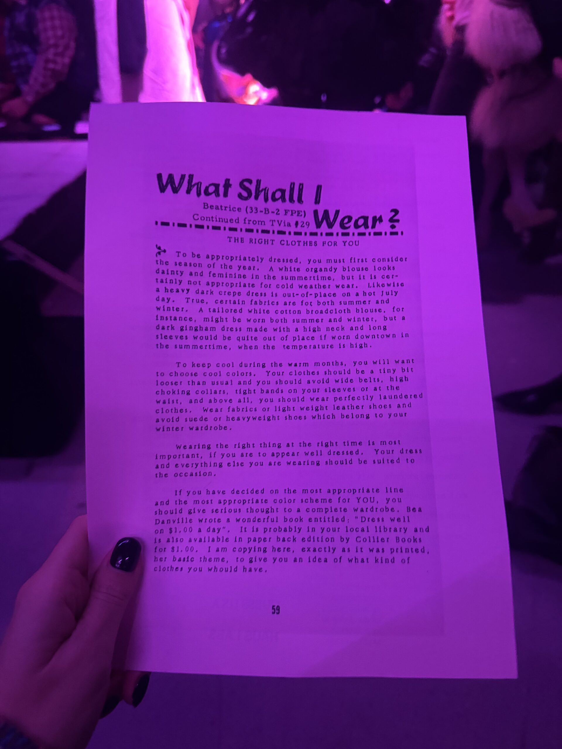 The runway is a movie, Real Housewives in deconstructed 1950s dresses, cardigans as hoods, plastic-covered handbags, hair with rollers falling out. An incredible soundtrack. The show ends and the PR shuffle us up to a greenroom where designers Bror August and Benjamin Barron are standing, holding flowers. I ask them about the show notes (check out the photo below) and they tell me they’re from Casa Susanna, a collective of trans women from the 1960s who collected clippings from newspapers and magazines on how to behave like a woman, how to walk like a model. “It’s a joyous collection,” I say, “You’re queering the tradwife.” Eyes roll. Â