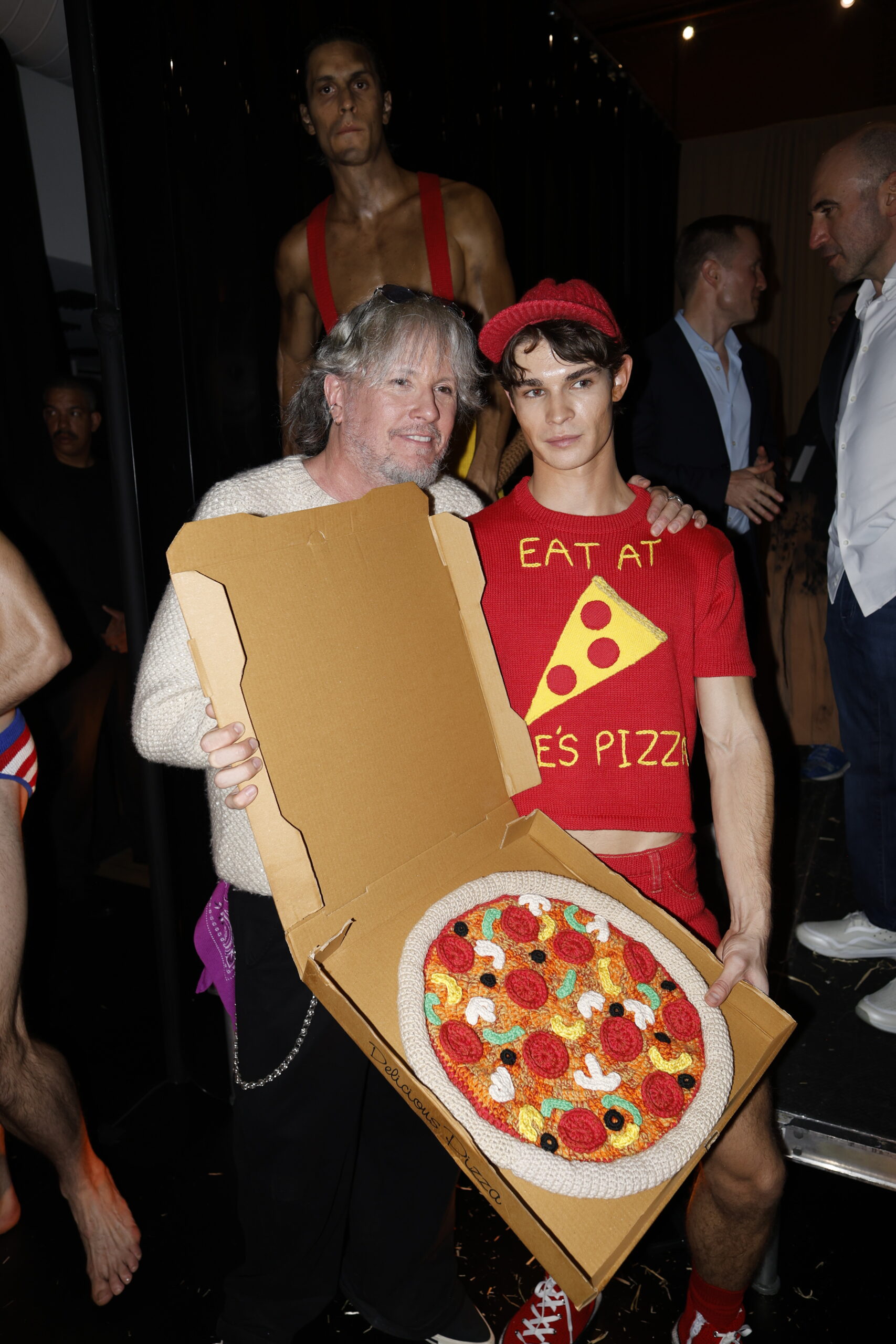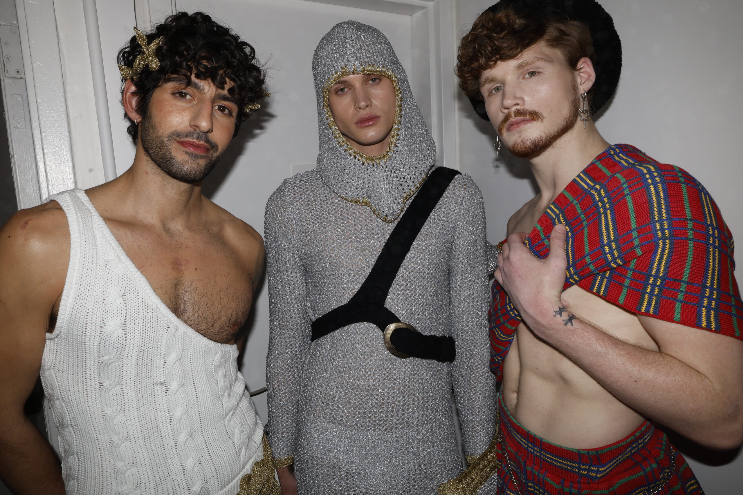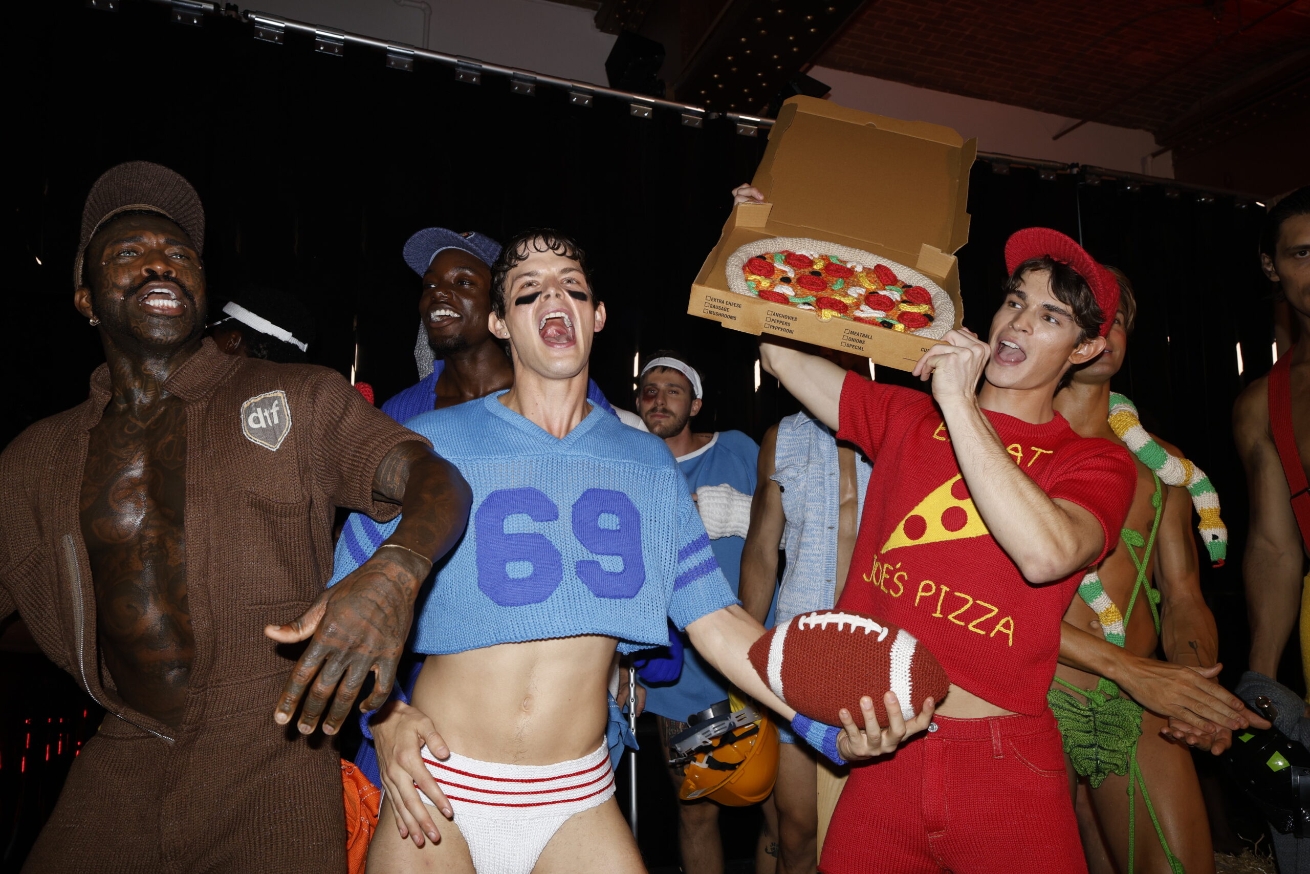 Applause. Cue the jungle sounds. Out comes a serpent-wrapped Adam—the man who made all the other men possible, I suppose. We then work our way through time: a knit toga, a knit suit of armor (no pants—not sure how well this knight would fare on the battlefield), a lumberjack. Disco-pop standards blare. A pool boy drips glitter. Tarzan stomps with half-closed eyes. Are paper boys usually of legal age? The accessories are technical marvels: a wool newspaper, a wool pizza, wool handcuffs.