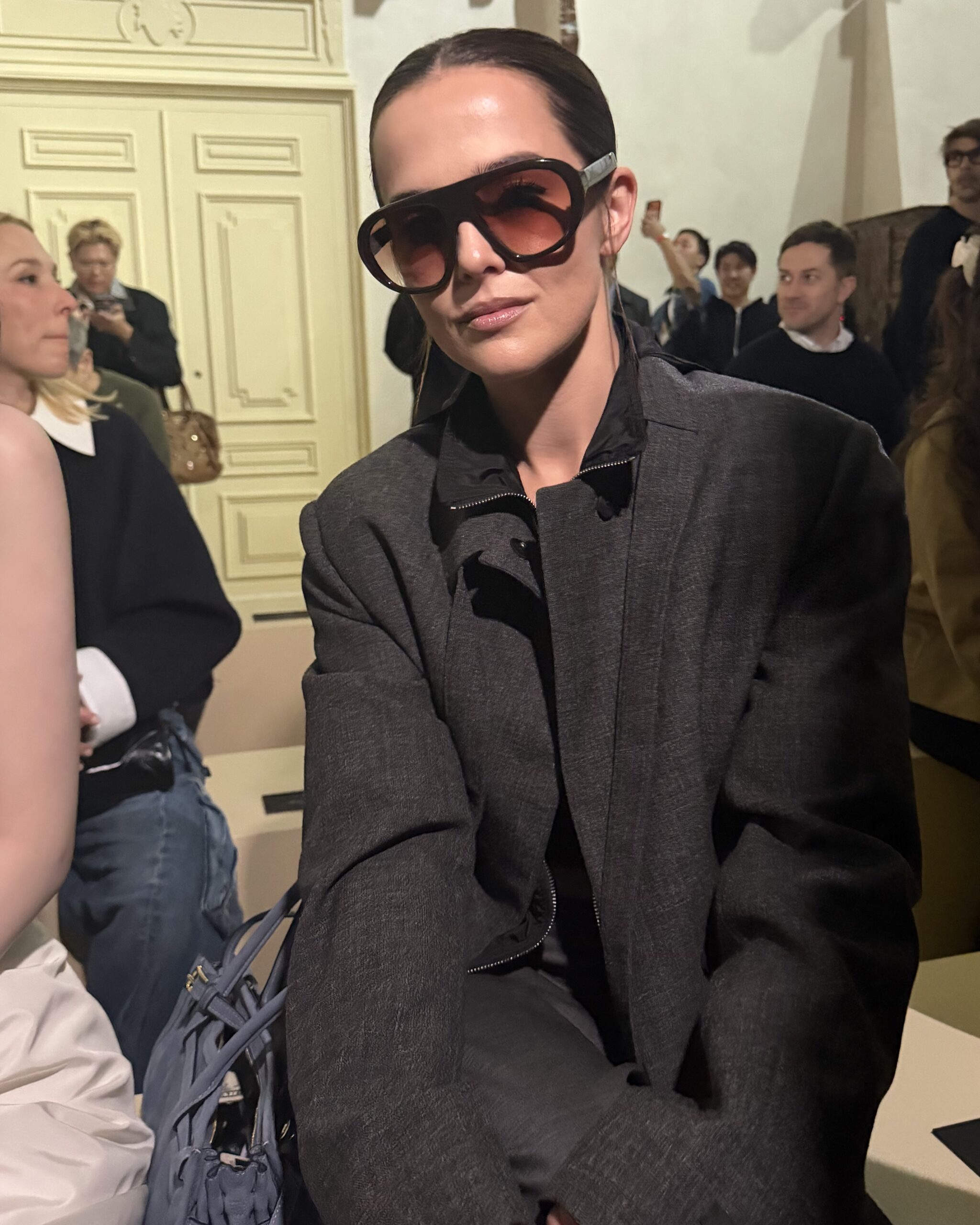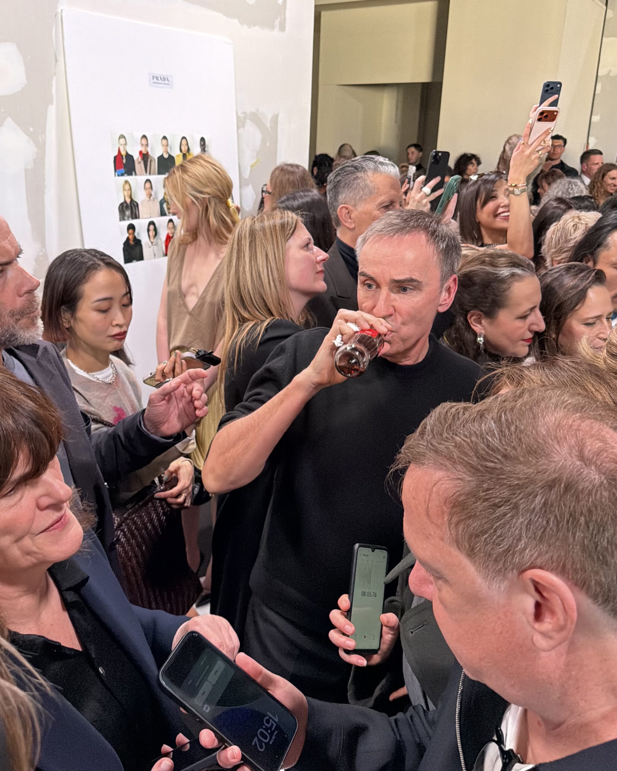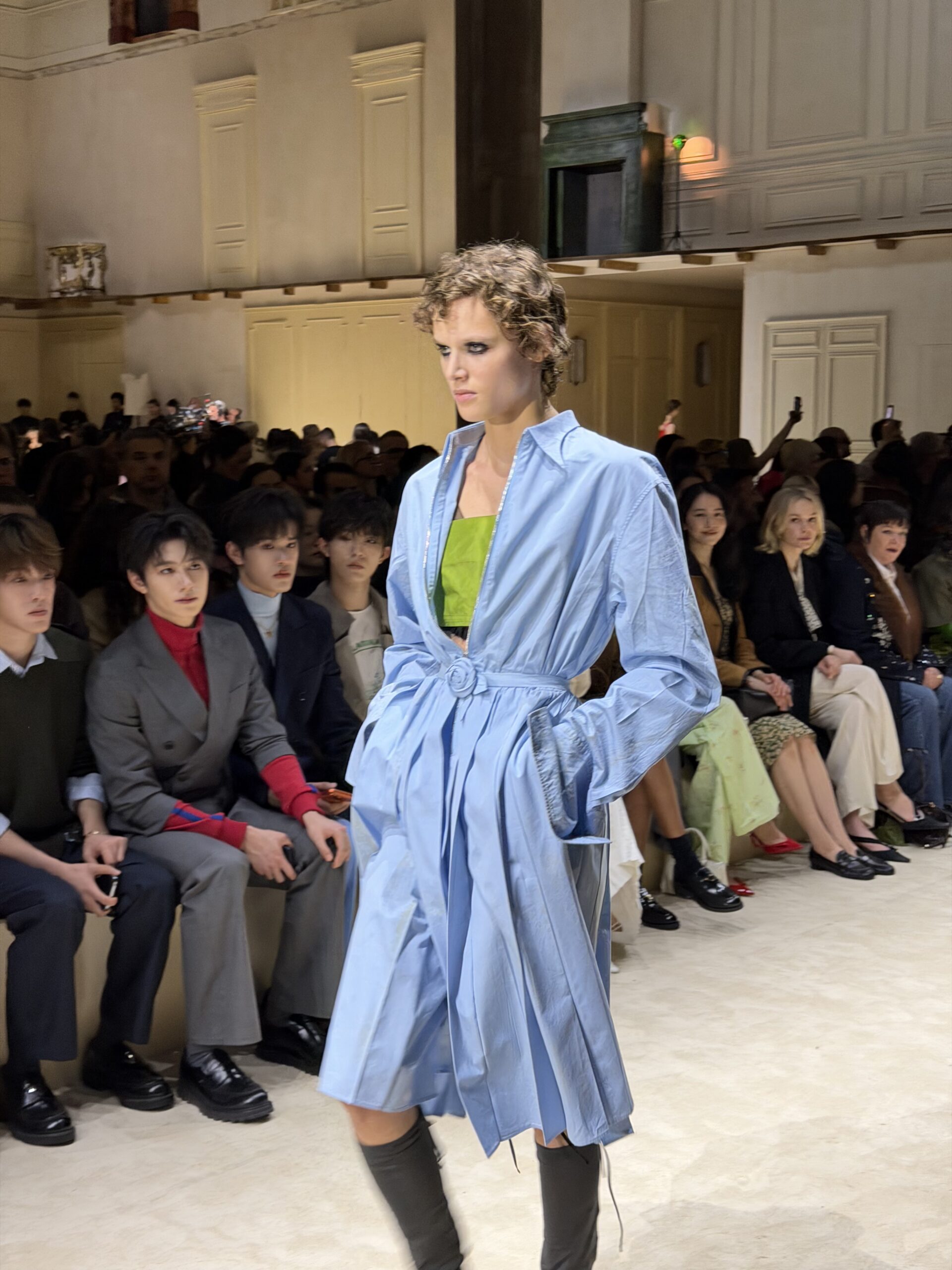 Late start today, thank god. It’s Prada day, or what this entire four-week fashion showdown hinges upon according to anyone who’s anyone. We’re curious what Raf and Mrs. Prada have cooked up. The men’s collection shown last month is always a good hint. The set was similar, with corrugated cardboard cutout living rooms stacked on top of each other. Surreal domesticity. Fireplaces floating in space. We got to the showspace early to see if we could catch a glimpse of Sarah Pidgeon, TV’s Carolyne Besette Kennedy. That iconic New York bird, in more ways than one. Unfortunately, I stepped on someone’s toe right as we were taking her picture because the press had descended upon the K-pop goddess Karina. Chaos! Madness! Fashion!