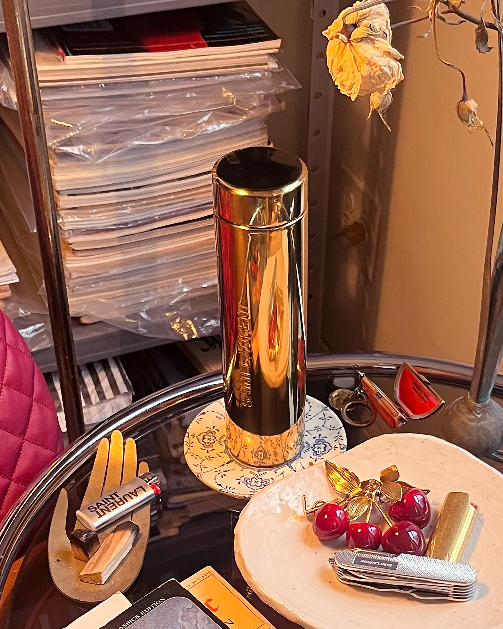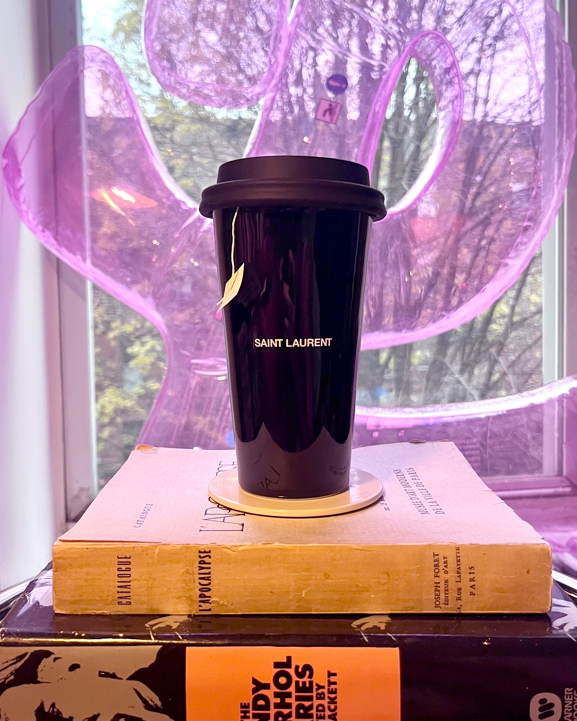 I’ll ignore the fact that Saint Laurent calls this a “coffee” mug—tea is the only thing I’ll be putting in here. Pairs very well with my books, but I make sure to always use a coaster, which in this case is a sleek, white lacquered wood one, also from Saint Laurent. What a happy coincidence!