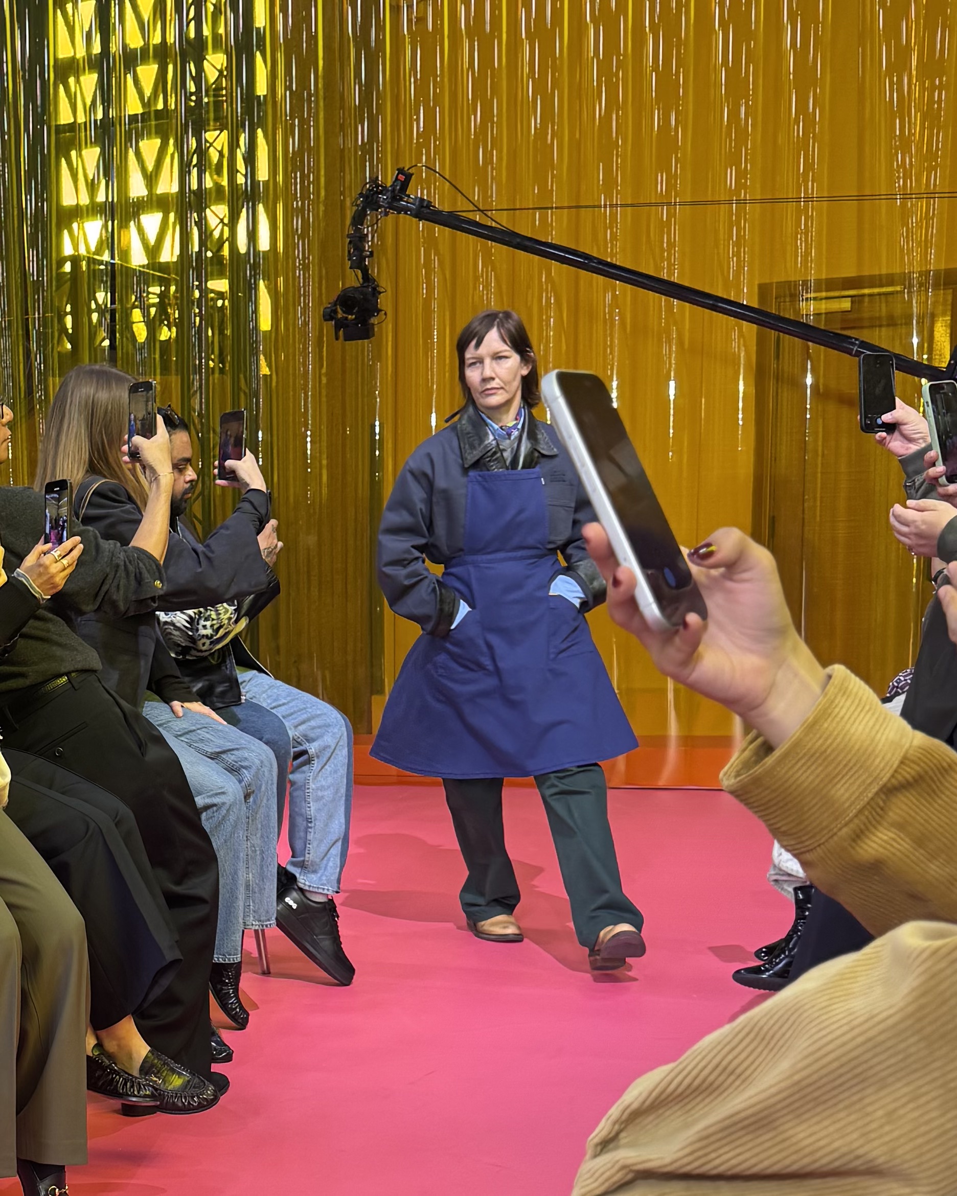 The opening look is workwear. An apron, a Dickies-esque pant. A solid boot. Slowly the bibs get more intricate. Lace, bedazzling, layers upon layers. Simple baby doll dresses. Almost all the shoes are flat. The theme is labor, motherhood. “The apron is a symbol of woman’s work,” Mrs. Prada says to a crowd of journos post-show. This all fits neatly with my new fashion week thesis: it’s exhausting to be a woman.