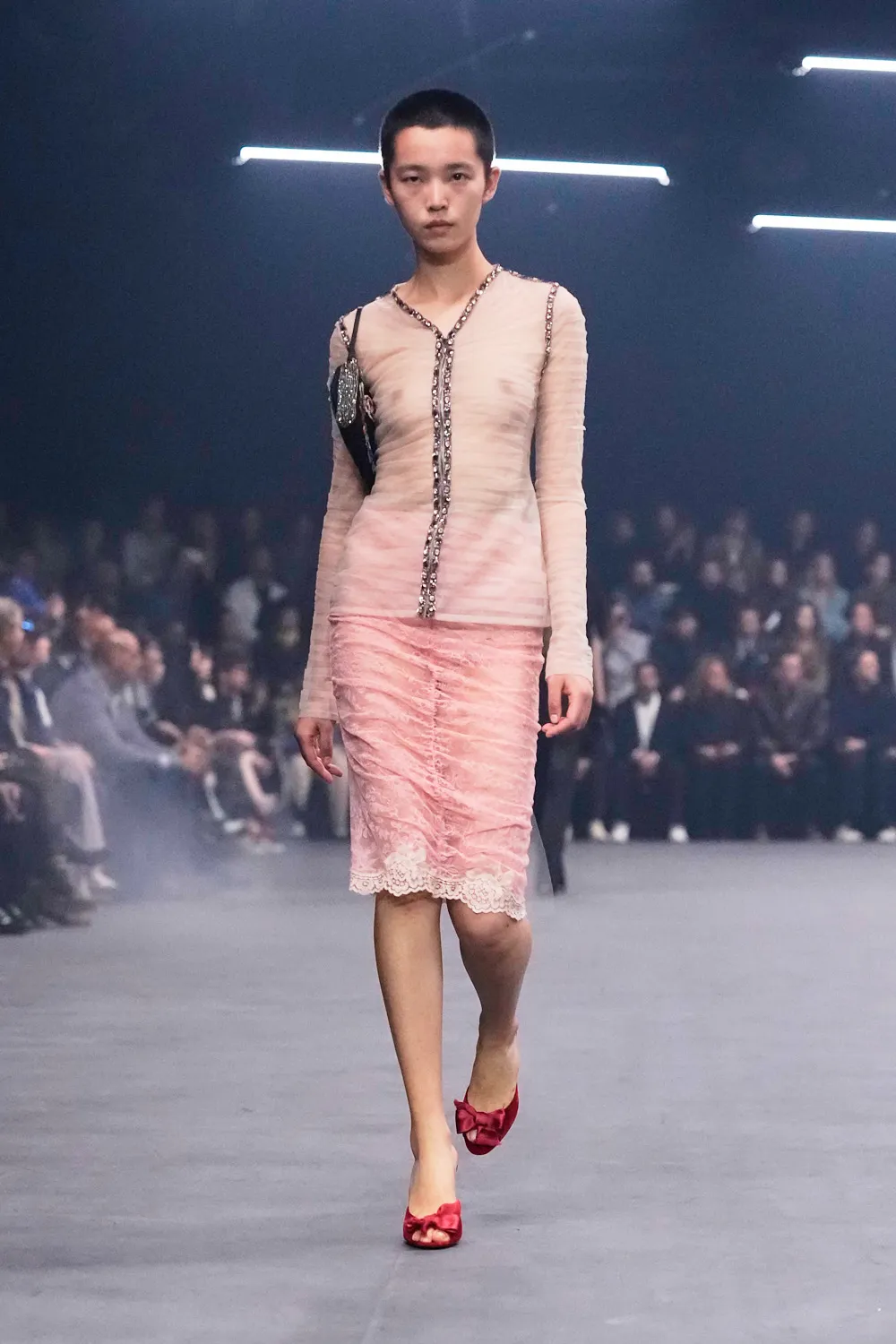 SCARABELLI: I’m looking right now at Look 22, this little pink number with the shoulder pads and bows and all of that. That’s the one I’m taking home. It’s all very Alessandro but the Valentino references are there.