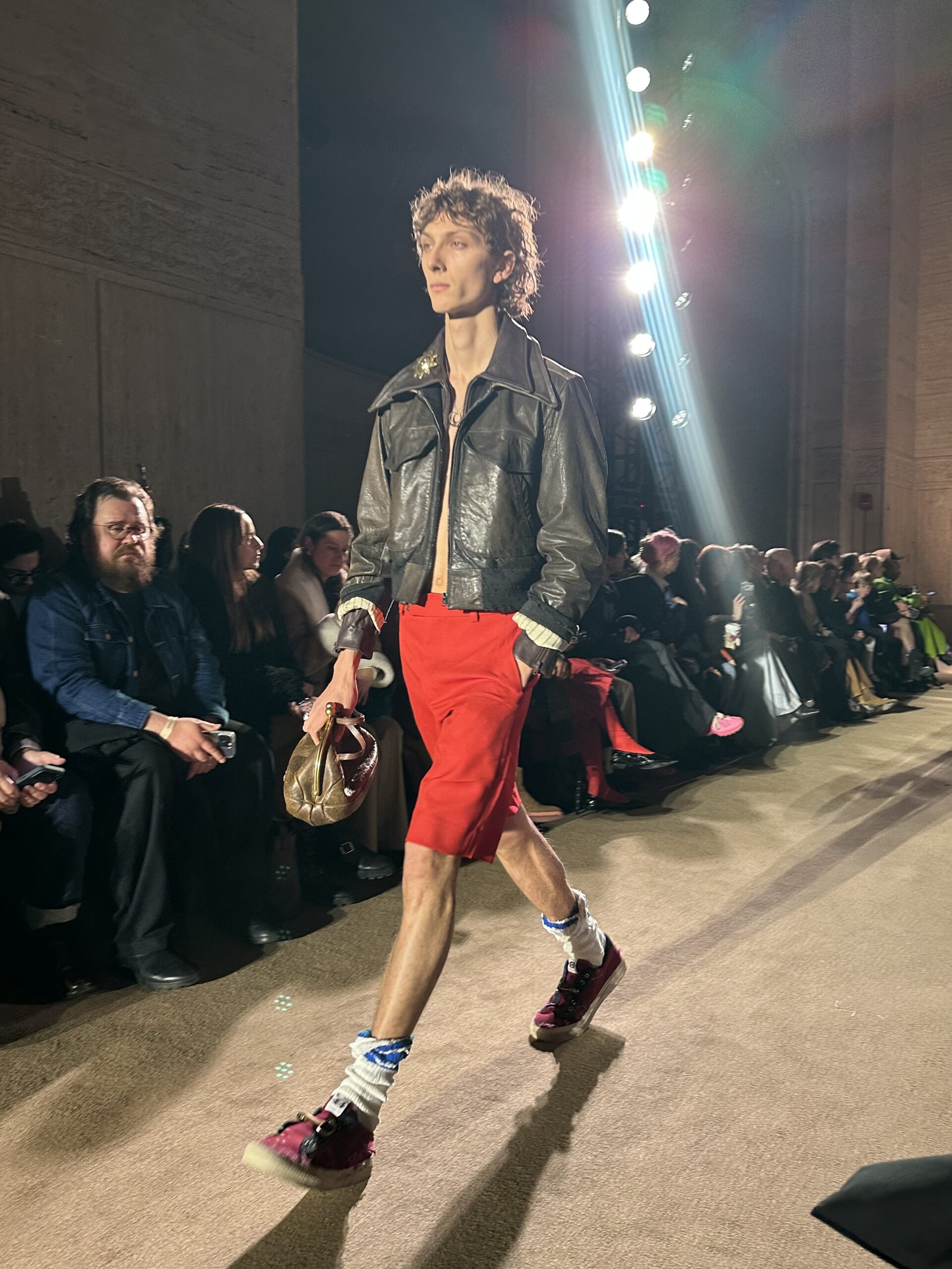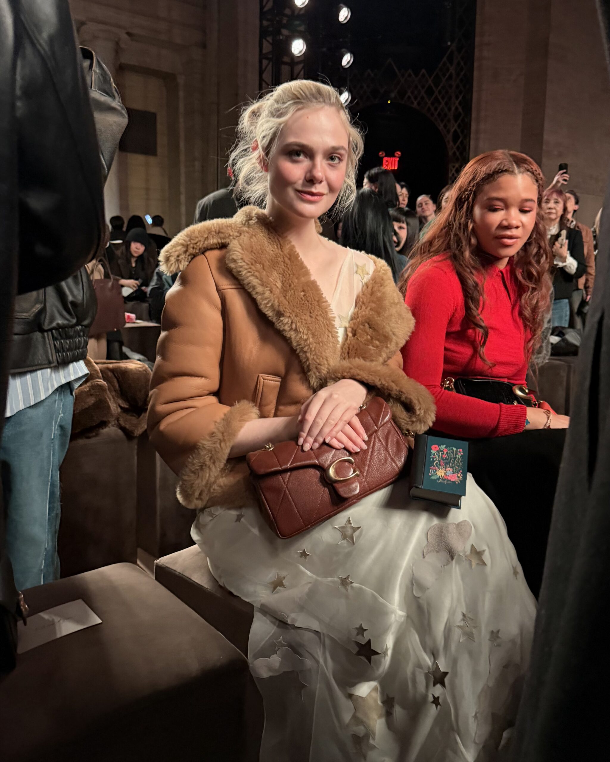 Welcome to New York Fashion Week! We had to ditch the taxi and run five blocks to make the Coach FW26 show at Cipriani Wall Street because of traffic, but the sexy front row vibes were absolutely worth traversing through dirty snow pyramids and aimless tourists for. Odessa Azion! Quen Blackwell! Omar Apollo! Academy Award nominee Elle Fanning! Sunshine Benzi’s first runway show! Cute stars, all of them kissing! Valentine’s Day is around the corner and love is in the air… On the runway, Coach’s creative director Stuart Vevers kept it interesting with sexy skaters, distressed jerseys, and the most amazing slouchy hole-y socks. Hot, hot socks! We want them, you need them. Lots of cool distressed Dust Bowl-meets-Rose Bowl Americana up cycled jeans, shrunken jacket layering, and cool depression-core silk dresses. Everyone had JBF hair. So funny to see these grungy kids wear kiss lock clutches. We’re into it! Skaters can do chic, too.