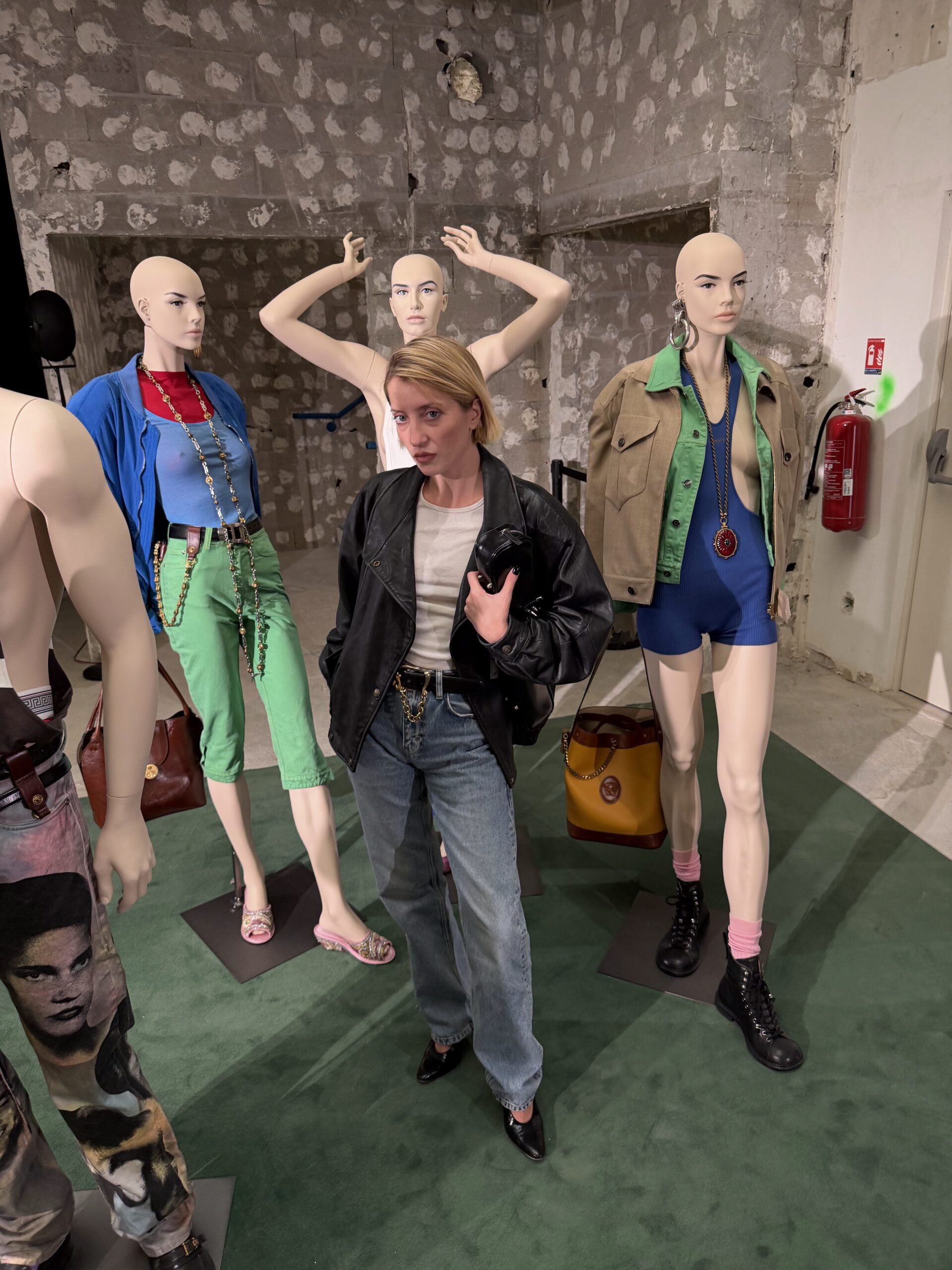 Mel and Julian and I walk into the Versace re-see and I’m embarrassingly elated. Dario’s debut may have been controversial but as a Miu Miu girl obsessed with ’80s style, it’s all I want and more: backless dresses with elasticated logo-adorned briefs peeking out from behind, big BIG shoulders on everything from eveningwear to patchwork leather, brightly colored jeans and neutral handbands, big ass jewelry, impeccable styling, short shorts. Not to mention the delicious showroom set design replete with vintage-style mannequins in outrageous poses (custom made for the occasion). I love Donatella but I’m also gays girl.