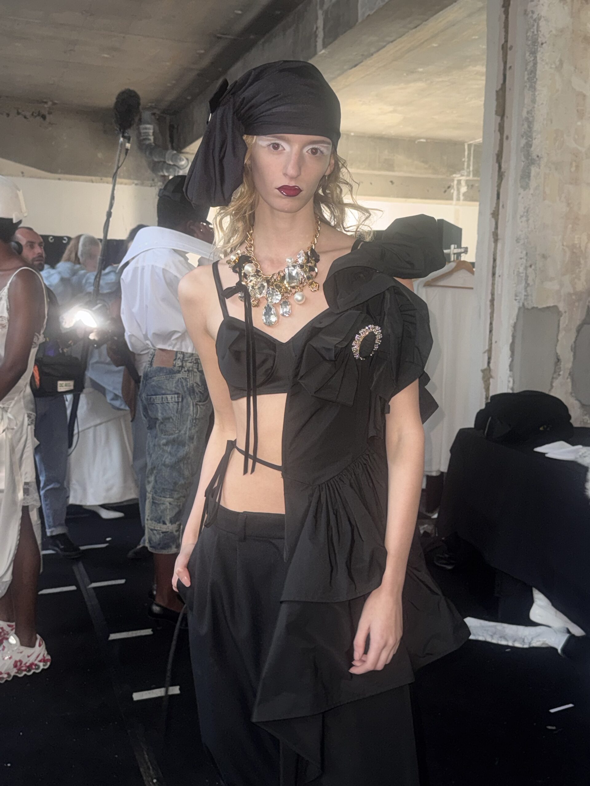 At Vaquera I spot Ryan Aguilar and we talk Big Apple fashion. He and Michel Gaubert made the soundtrack for this very New York show. Pop and rap sped up and deconstructed, an elevated runway, a spotlight tracking models with swagger rarely seen anymore. “We moved to Paris this summer – iconically the center of good taste,” the show notes read. “But what does that mean?” The answer? ’80s party dresses sliced in half, a t-shirt silk screened with headphones, and a sample of the brand’s new Comme Des Garcons perfume. Notes of cologne samples from magazines (the kind you peel and sniff) with something animalistic underneath. Kinda nasty. Kinda unsettling. Kinda good?