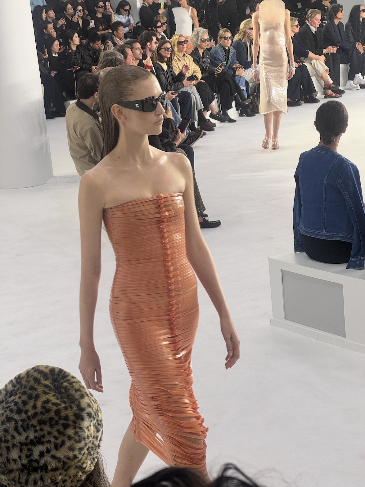The bench beneath me is vibrating with the music as if I’m in one of those experiential movie theaters. “It’s 34 degrees in Paris, the sun is rising,” a voice bellows behind the booming base. Some of the models faces are obfuscated by mesh, others by the brand’s brand new shades that were also gifted to showgoers. But I still notice all the new supers walking: Alex, Anok, Loli, Mona, Lulu, and my favorite newcomer Kai. It’s getting hot in here, like, physically.