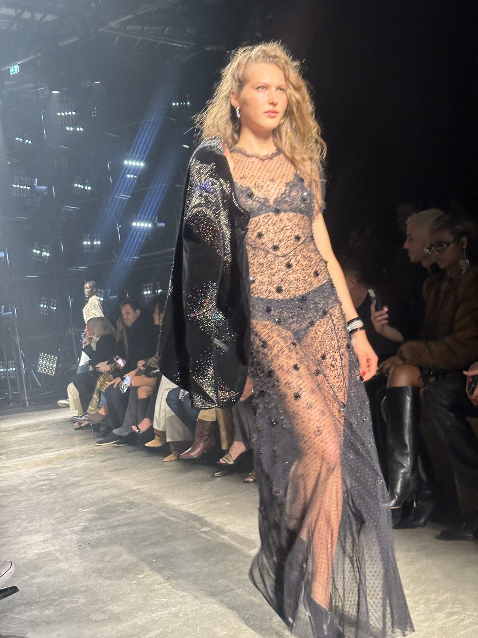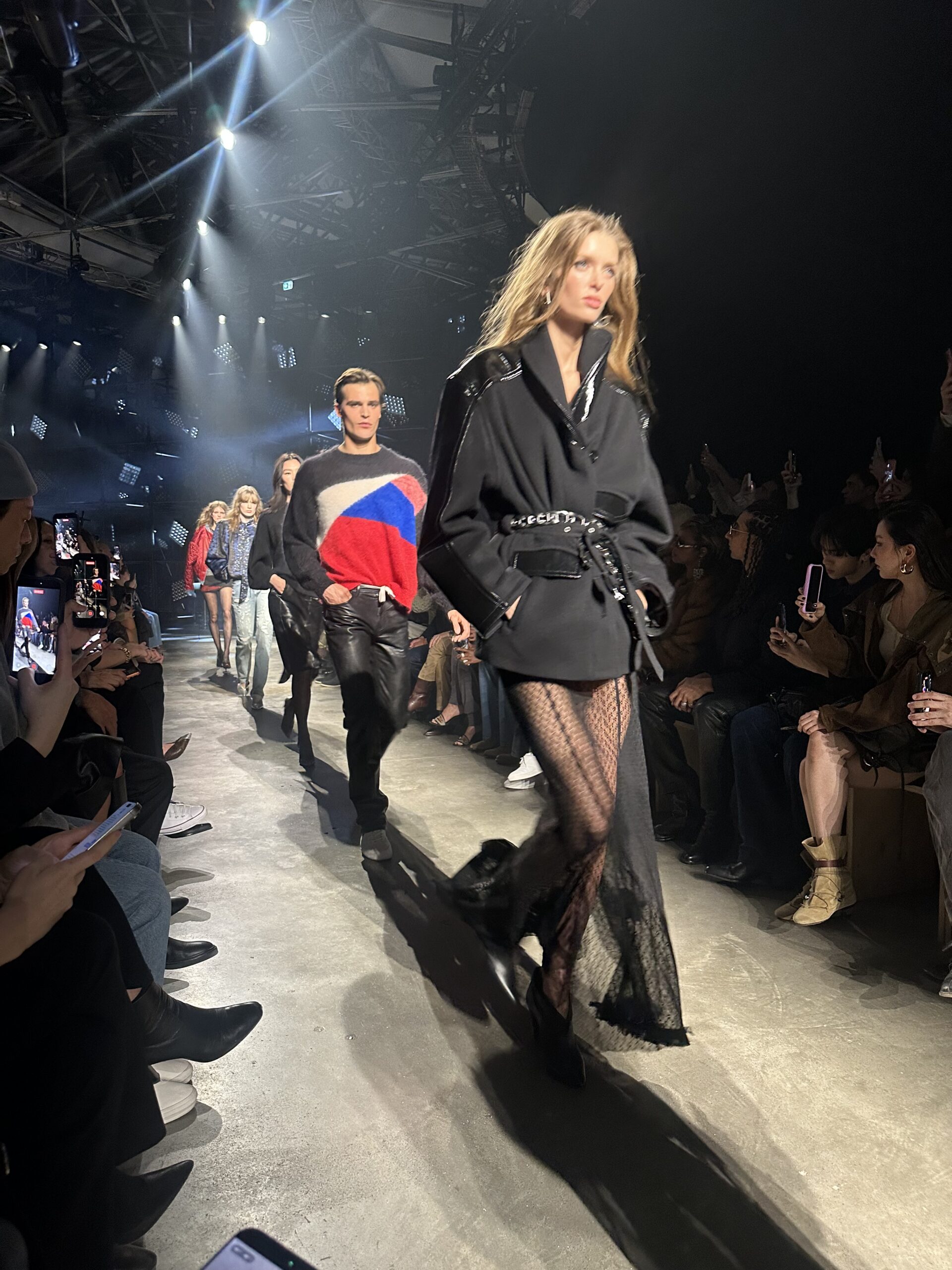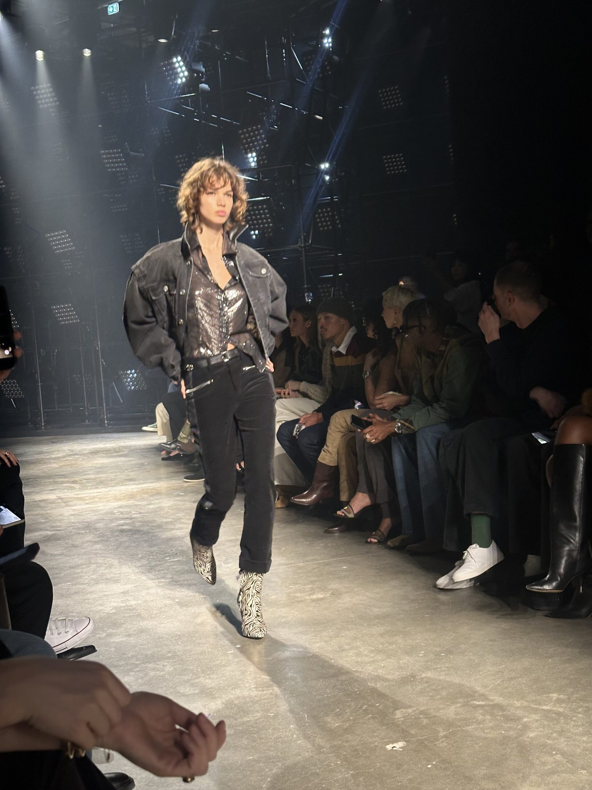 Lights, camera, ready for that action. The Isabel Marant Fall 2026 collection took us from Palais de Tokyo to the club. Backstage after the show, we caught up with supermodel Alex Consani, who told us the vibe was 2010s club girls in New York. Felt that. “Was I pumping too hard?” she asked. NEVER! We always love Isabel Marant for bringing the party at the end of a long day of shows. This time, in front of some flashy stage lights, the girls came through in jackets thrown over their shoulders and messed up, flipped over side parts. The takeaway silhouette of the collection was a blouson jacket, either in leather or denim or nylon, paired with coochie cutters or slim flared jeans and knee-high boots. All in a palette of black, red, blue and sparkly. So sexy. Mona Tougaard closed the show in a shimmering corset top and ripped jeans, truly the party girl uniform of today. On our way out, we caught Reneé Rapp in the infamous sneaker wedge. She told us she has three pairs. I’m jealous.