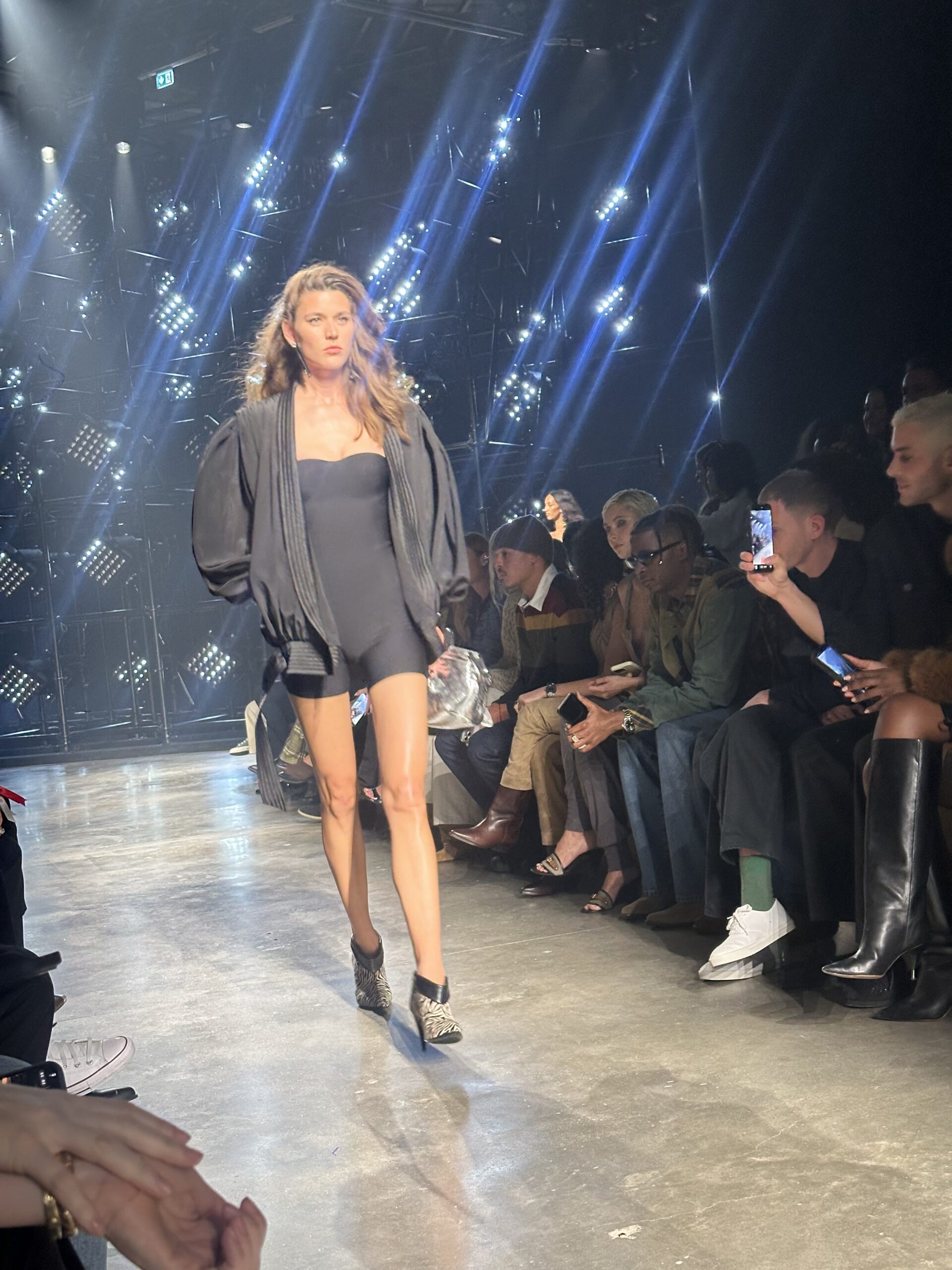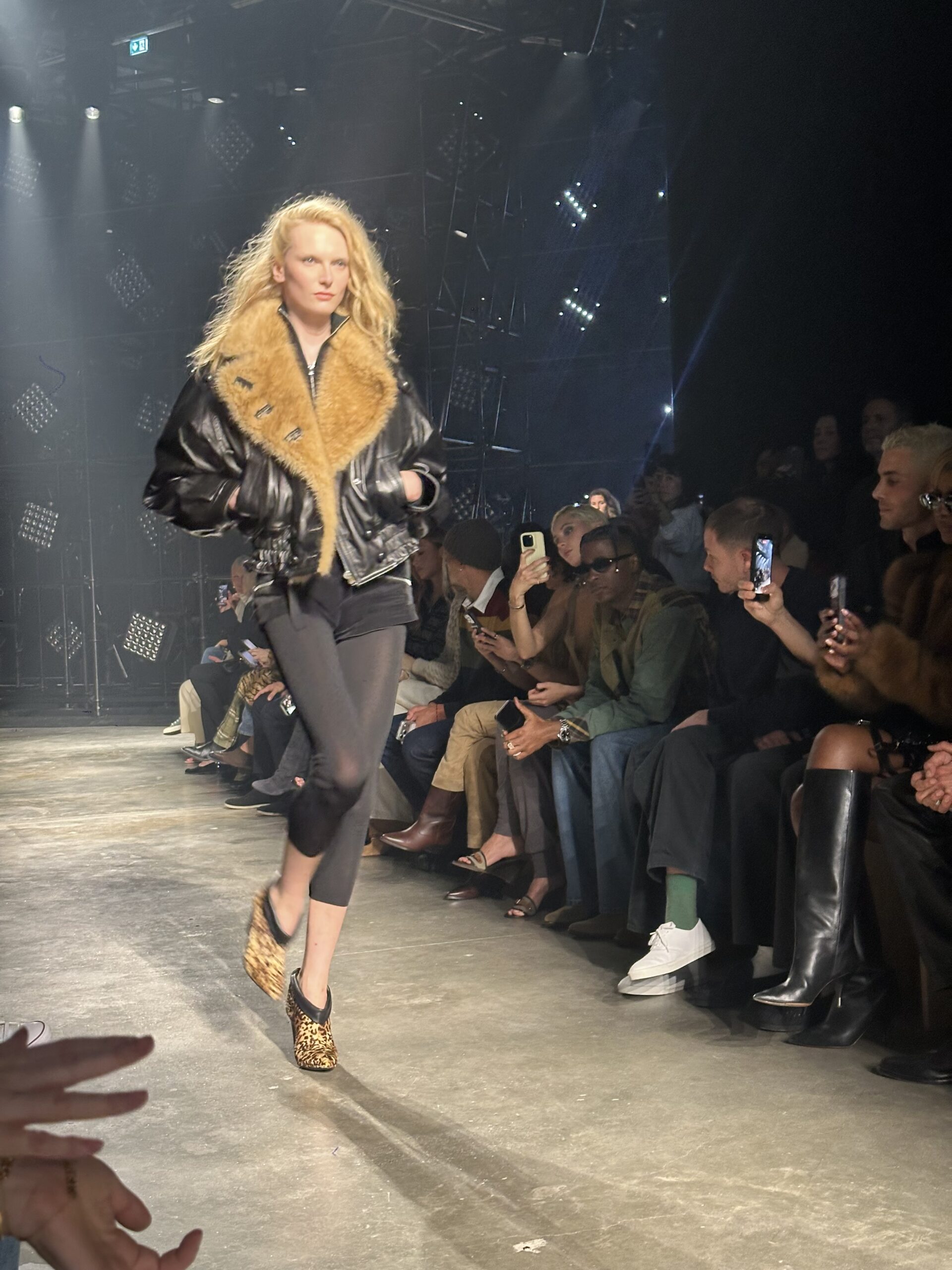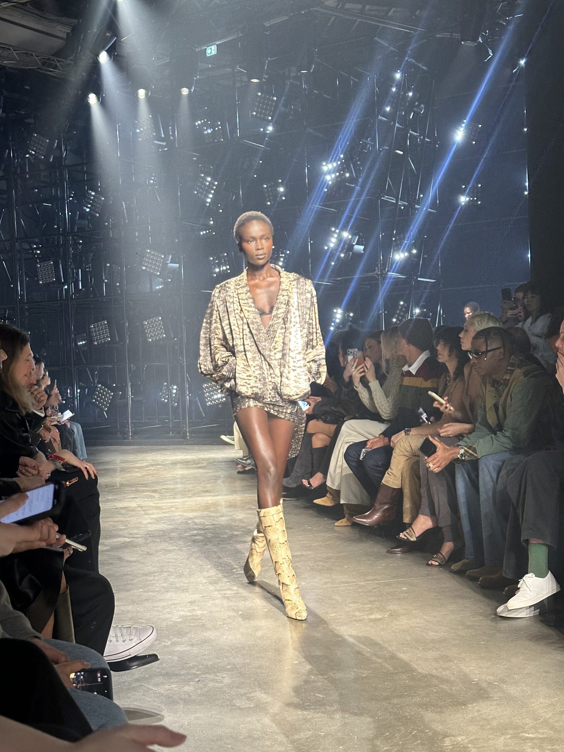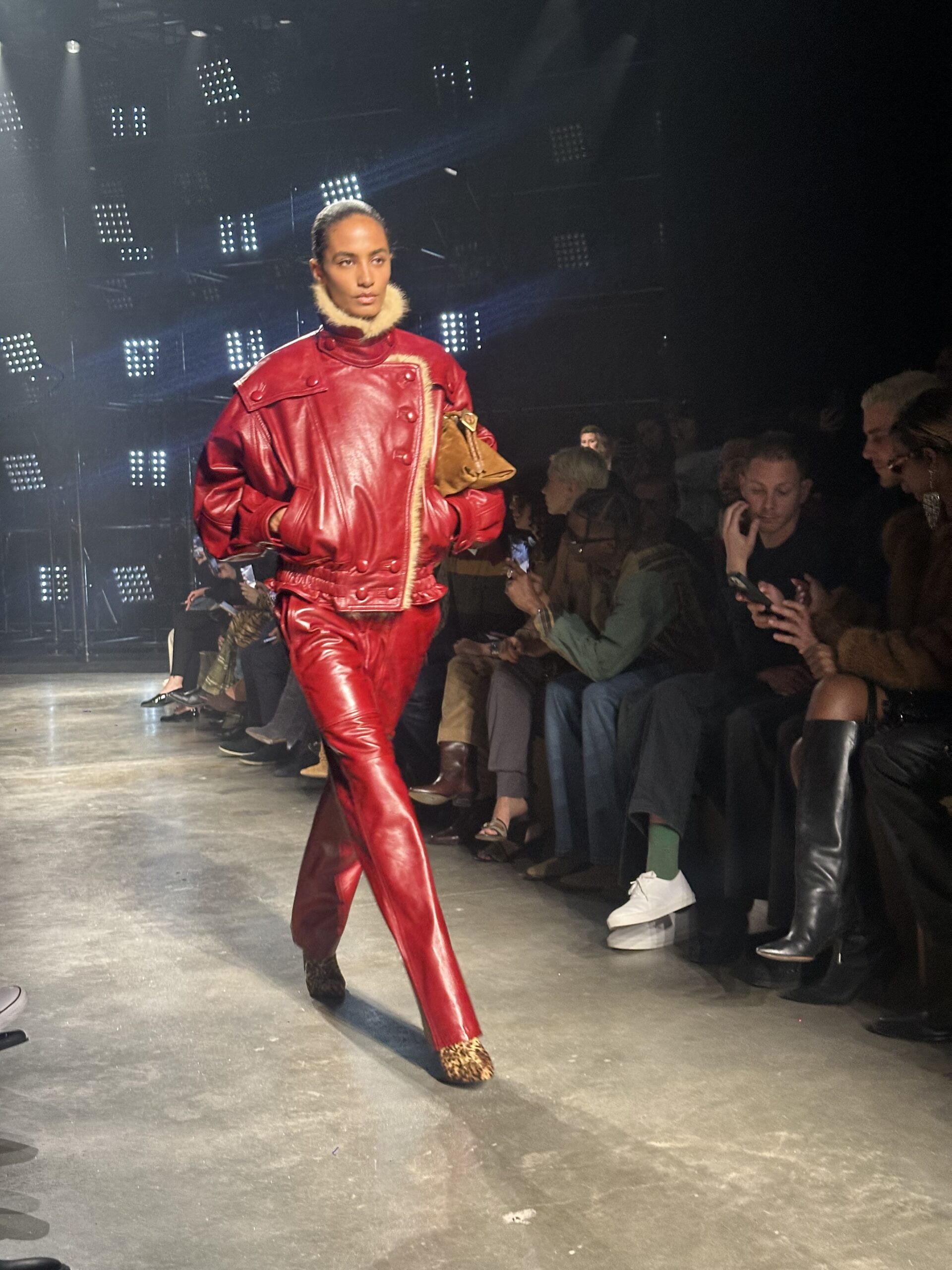 Lights, camera, ready for that action. The Isabel Marant Fall 2026 collection took us from Palais de Tokyo to the club. Backstage after the show, we caught up with supermodel Alex Consani, who told us the vibe was 2010s club girls in New York. Felt that. “Was I pumping too hard?” she asked. NEVER! We always love Isabel Marant for bringing the party at the end of a long day of shows. This time, in front of some flashy stage lights, the girls came through in jackets thrown over their shoulders and messed up, flipped over side parts. The takeaway silhouette of the collection was a blouson jacket, either in leather or denim or nylon, paired with coochie cutters or slim flared jeans and knee-high boots. All in a palette of black, red, blue and sparkly. So sexy. Mona Tougaard closed the show in a shimmering corset top and ripped jeans, truly the party girl uniform of today. On our way out, we caught Reneé Rapp in the infamous sneaker wedge. She told us she has three pairs. I’m jealous.