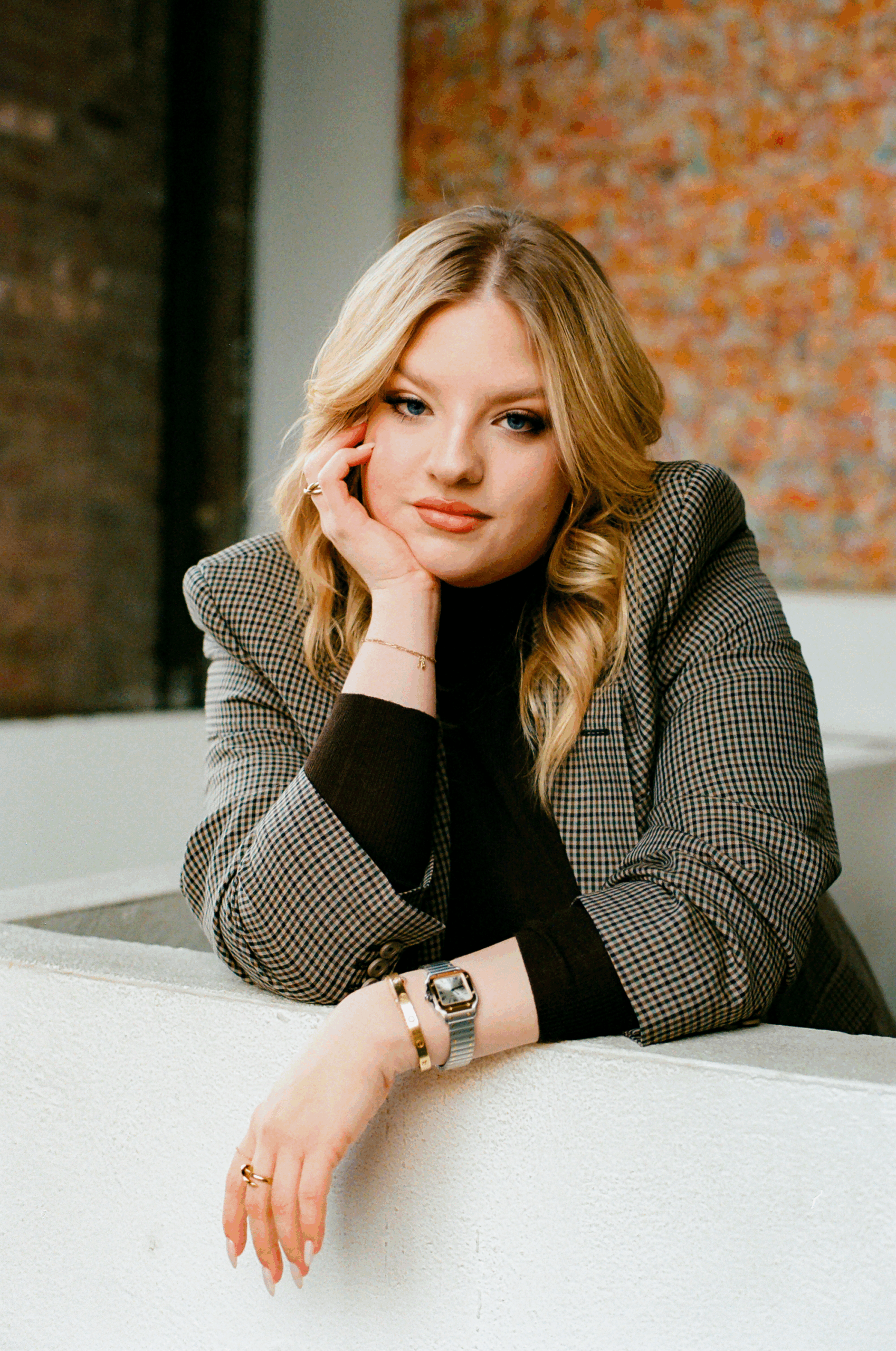 Jacket by Balenciaga. Sweater by The Frankie Shop. Earrings, Bracelets, Watch, and Rings by Cartier.