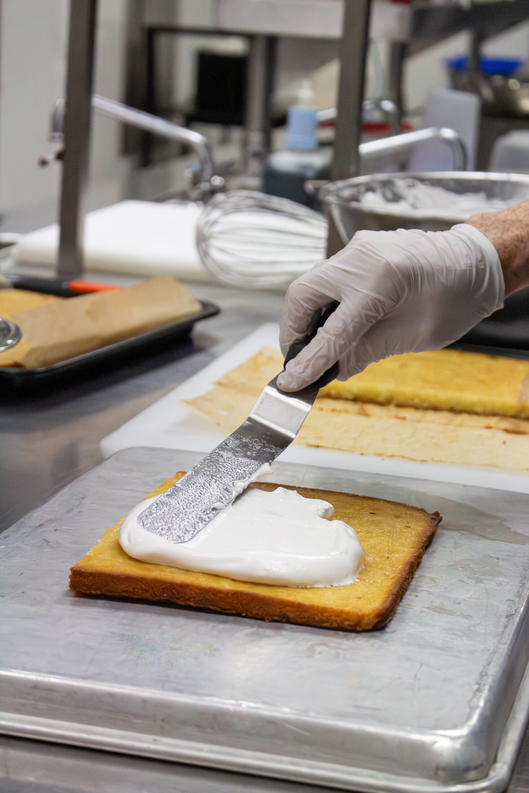 SCHIFF: We’ll do the batter, but then I’ll talk you through what would happen after all that, because it’s got to bake and cool and all of those things. So this is going to be a two-layer sheet cake and then I’m going to do a meringue filling and frosting on the outside. Then it’ll get covered in coconut. So the cake itself is pretty straightforward. It’s an oil-based cake. The reason why I like oil-based cakes is because they stay really, really moist. So I’ll either do an oil-based cake or if I’m using butter, I’ll basically work in a portion of oil and they become really light and fluffy and it’s a really nice texture that it yields. I’m using a neutral oil for this, let me not spill this on my floor.