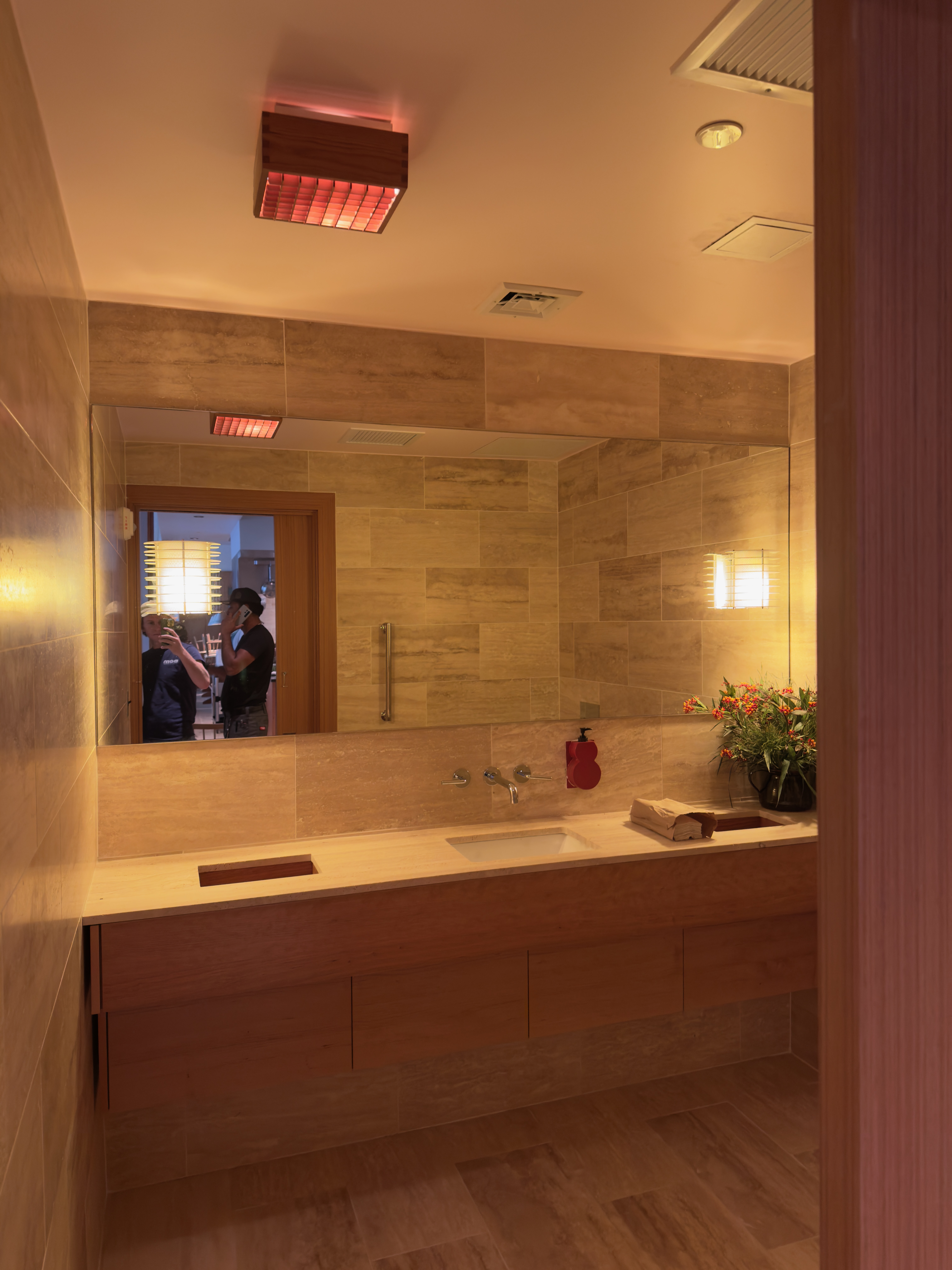 This was the day before our press preview. Scrubbing day. We installed the most beautiful but slightly delicate Dinesen Douglas fir floor and it needed a hand scrub before people could see it. I also spent about two hours adjusting the bathroom lighting and taking many selfies to find the right glow for our guests. It turned out that the vintage sconces I bought only work with fluorescent lighting, so I had to bring out my slightly not fire code hack of putting our cream-colored kitchen masking tape on the lights to create the right color and light diffusion.