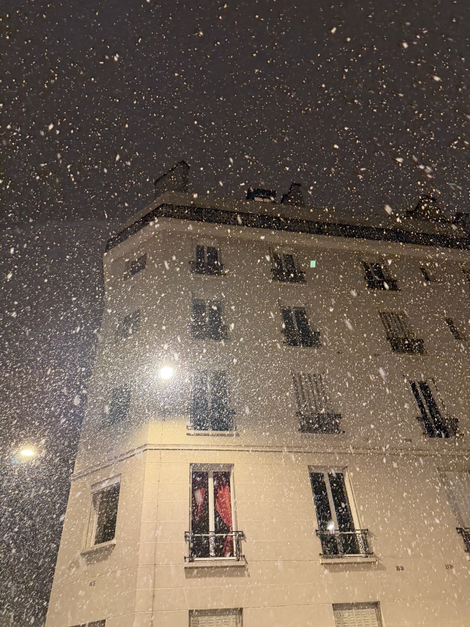 “This was two weeks ago in Paris. The snow was so heavy one night, and it was beautiful. It came out of nowhere. It wasn’t snowing anywhere else in Europe, and it makes the city even more magical. I really felt like I was back on set, like, Where are the lights? Where’s the camera crew? This was in Neuilly, which is a borough just on the outskirts of Paris, and I love spending time there. It’s close to everything, but very quiet, and it almost feels like a little village.”